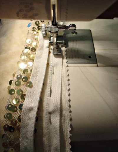 Em seguida, leve a peça para a máquina de costura e costure, em um dos lados de sua almofada, o zíper. E no momento de costurar, costure o tecido de fora, com as lantejoulas, e o forro juntos.