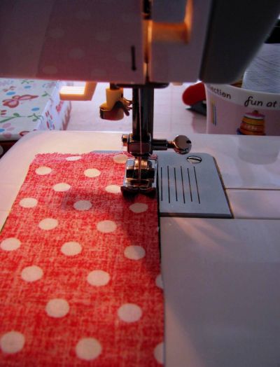 Em seguida, una os tecidos, com o auxílio da máquina de costura, direito com direito e com uma costura pelo avesso e nas extremidades dos tecidos, formando um bloco.