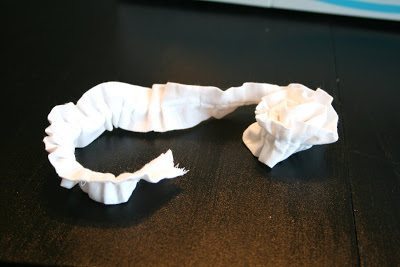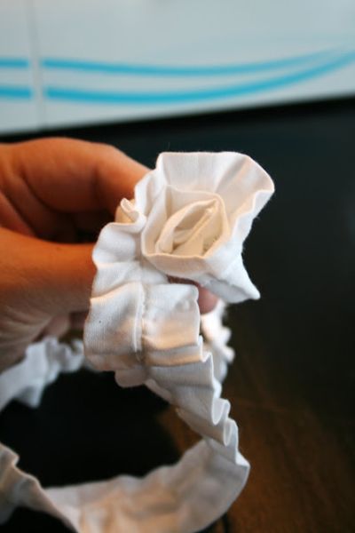 Agora, comece a moldar a sua rosa com a tira já franzida e deixando a ponta amassada no meio, como miolo da sua rosa.
