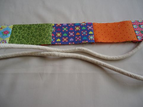 Em seguida, corte uma tira de 1,64 c, × 4,5 cm em um tecido estampado bem colorido ou faça um viés de patchwork. Corte 20 retângulos de 10 cm x 4,5 cm e costure unindo estes retângulos. Assim você terá um viés bem colorido.