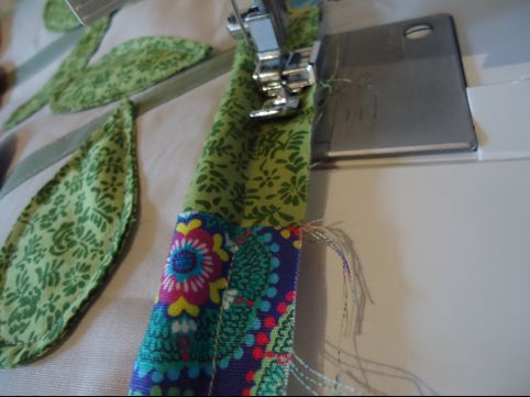 Agora, costure as folhas praticamente com o mesmo processo das pétalas, a diferença é que você irá fechar em toda a volta até o bico. Para desvirar, faça uma abertura na parte de trás usando um abridor de casa. Corte, desvire e passe à ferro, assim como as pétalas e depois prenda nos caules passando uma costura em todo o contorno das folhas.