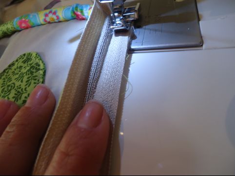 Logo após, troque o pé calçador de sua máquina pelo pé de zíper (de agora em diante você usará apenas o pé de zíper em toda a costura restante) e encape 1,68 cm de cordão São Francisco com o viés.