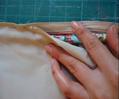 Em seguida, costure um lado do zíper direito com direito na parte de baixo da frente de sua almofada.