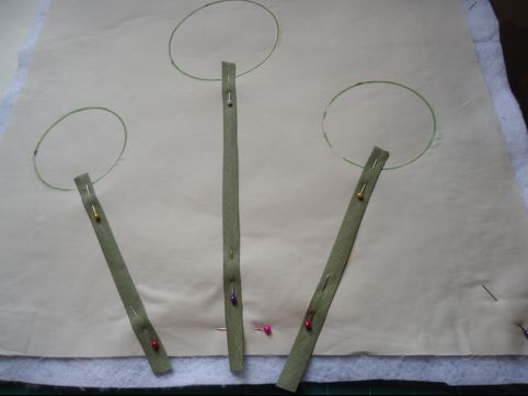 Logo após, corte um quadrado de 42 cm 2 vezes no tecido bege e 1 vez na manta acrílica (corte a manta com uma sobra). Coloque um dos quadrados do tecido bege sobre a manta, risque da maneira que preferir os moldes dos miolos das flores. Partindo destes traços, posicione o viés para formar o caule de cada flor. Alfinete e costure prendendo toda a extensão do caule.