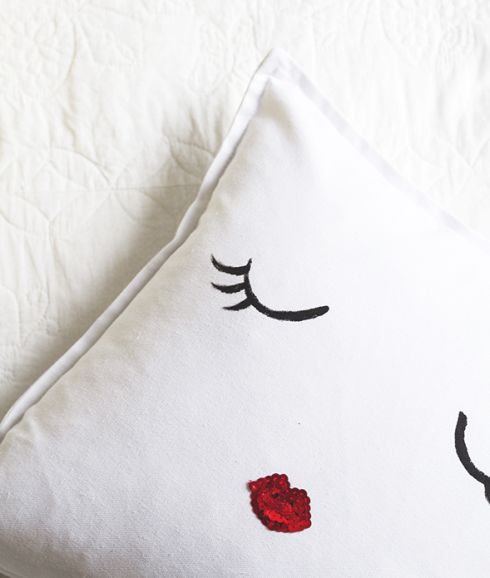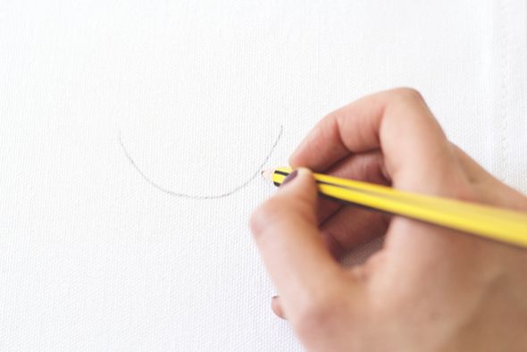 Comece fazendo os olhos de sua almofada, desenhando, com o auxílio do lápis, um meio-círculo no alto da almofada e em seguida, fazendo três cílios alongados em cada olho.