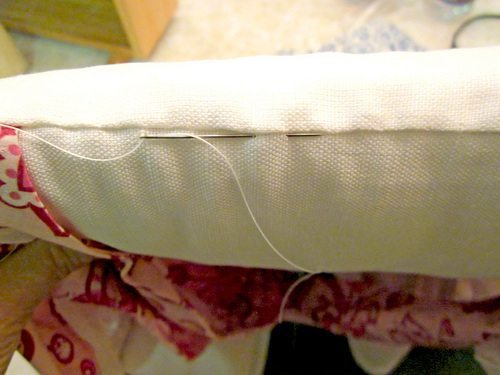 Em seguida, costure ao redor, encha a peça com a espuma já cortada com o tamanho do assento, e feche a abertura com alfinetes para costura.