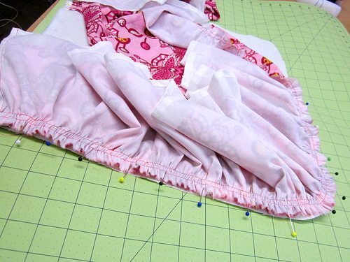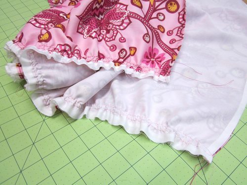 Logo após, corte os babados e franza-os, à máquina. E aqui são dois tecidos diferentes para fazer o babado. Mas se você quiser pode fazer com um único tecido.