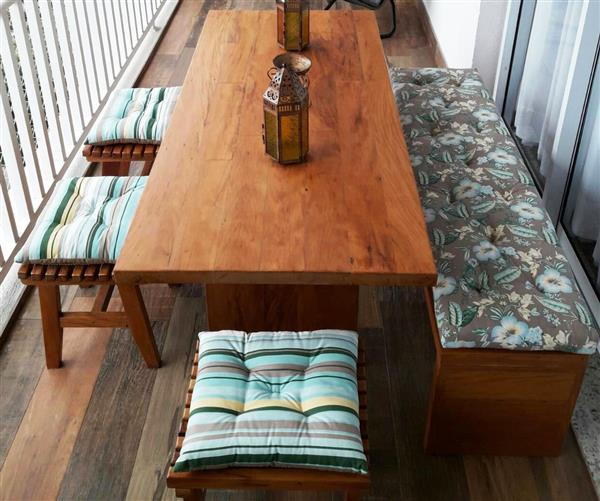 Nesse caso, as almofadas podem ser aplicadas tanto no assento como no encosto, criando um conjunto super criativo. Você pode, inclusive, misturar tecidos lisos e estampas para criar uma decoração inovadora com almofada futon!