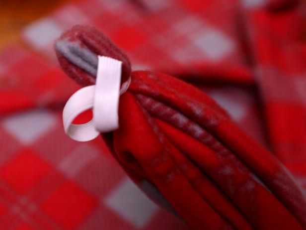 Posicione um círculo sobre o outro, com os lados do direito do tecido para fora e faça um nó unindo duas tirinhas.