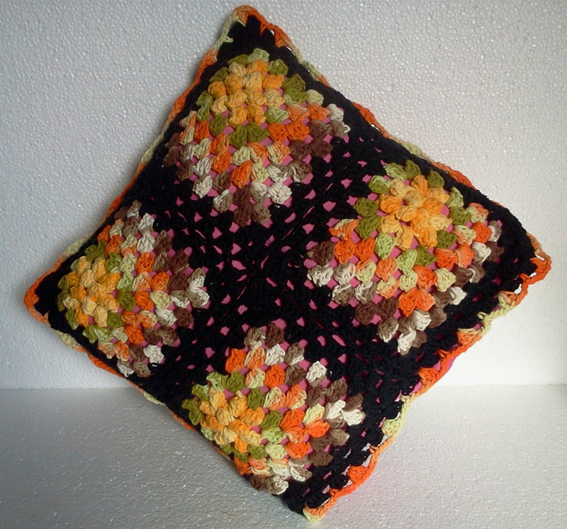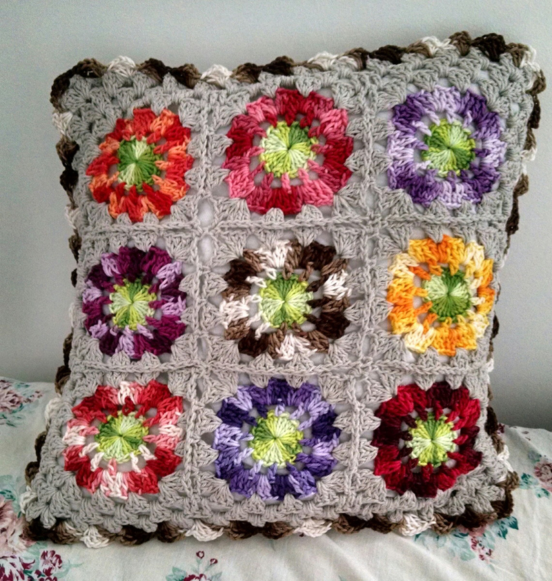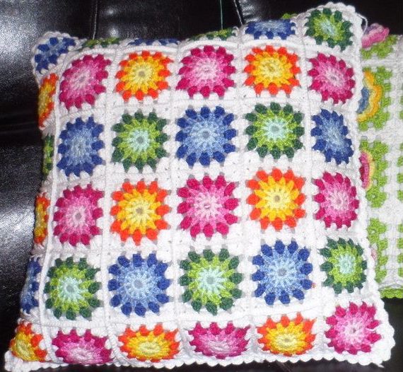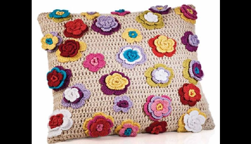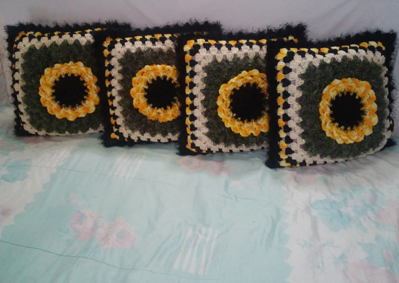 Você pode até criar flores em suas almofadas coloridas de crochê, como o girassol.