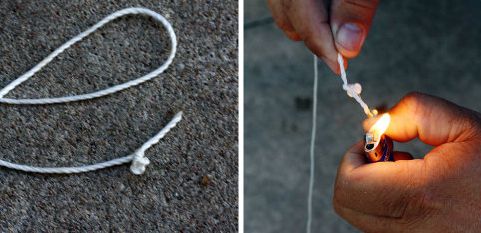 Comece dando nós e queimando as pontas da cordinha de nylon, com o auxílio do isqueiro, para não desfiar.