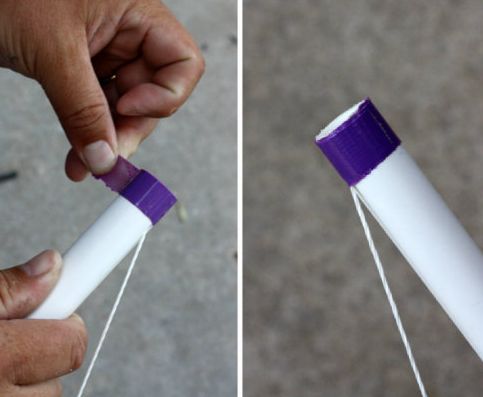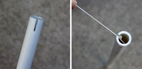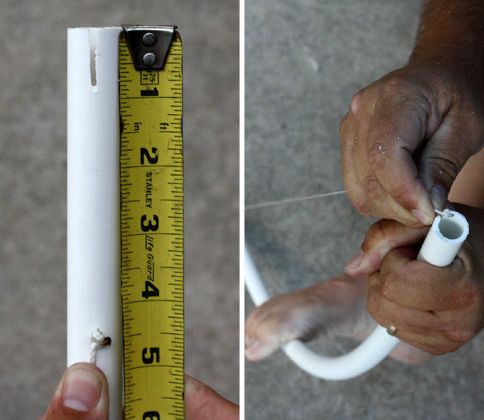 Em seguida, com o auxílio da serrinha, faça um “corte” em cada ponta do cano de PVC e passe a cordinha de nylon por um dos cortes.