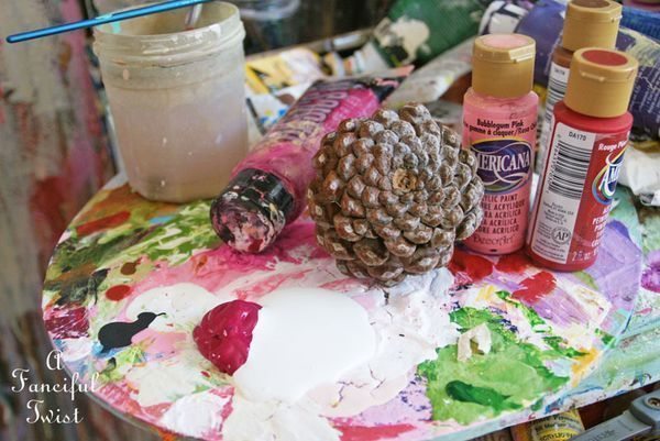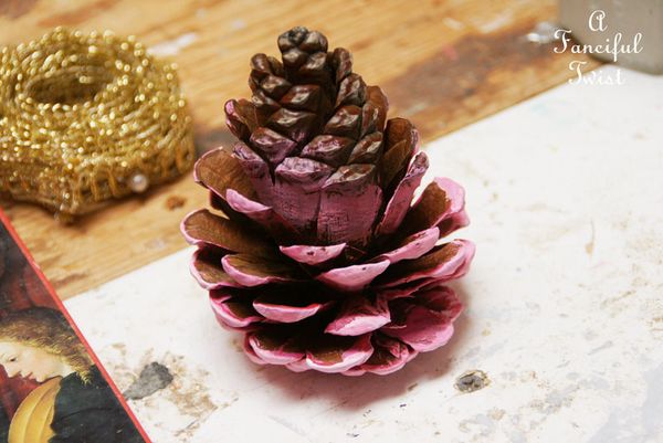 Em seguida, siga aplicando mais tonalidades de tinta acrílica em sua pinha, criando o efeito desejado.