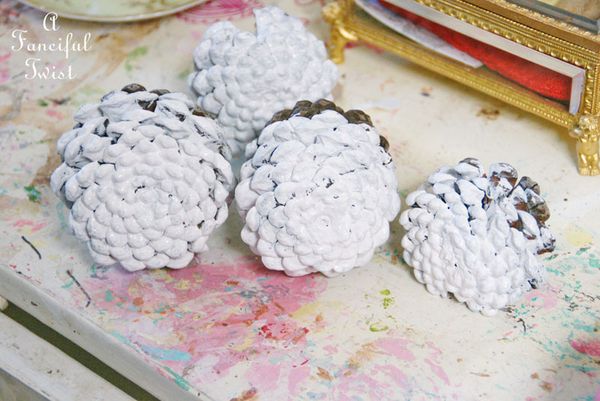 Se você quiser, aplique uma camada de tinta acrílica branca em todas as pinhas que você for utilizar, para que as cores da pintura fiquem mais evidentes, porém não e necessário, você pode começar a pintar a sua pinha com outra cor que você quiser.