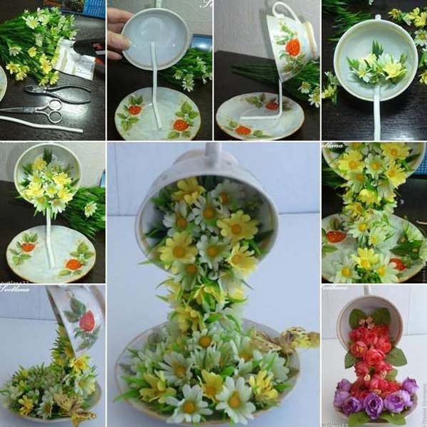 As flores artificiais são mais fáceis de trabalhar, pois não vão deteriorar rapidamente e você pode torcer o caule ou fixá-lo da forma que for, pode fixar até mesmo em arranjos com xícaras, por exemplo. Cole ou pregue com grampeador as suas flores artificias no objeto que desejar.