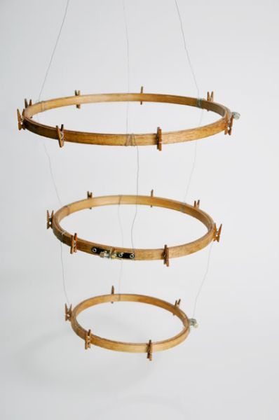 Logo após, corte pedaços de arame, com o auxílio do alicate com corte, e amarre estes pedaços de arame ao redor dos aros para bordado, criando o seu móbile.