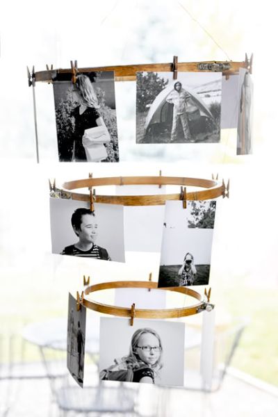 Em seguida, para finalizar a sua peça, basta pendurar o seu móbile e prender as fotos escolhidas nos prendedores de madeira. E está pronto!
