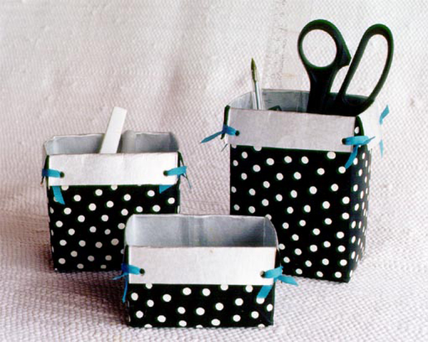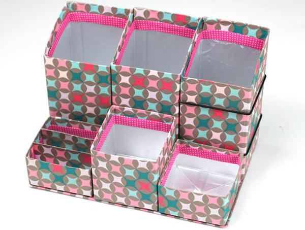 Reaproveitar as caixas para porta lápis e tesoura também é legal.