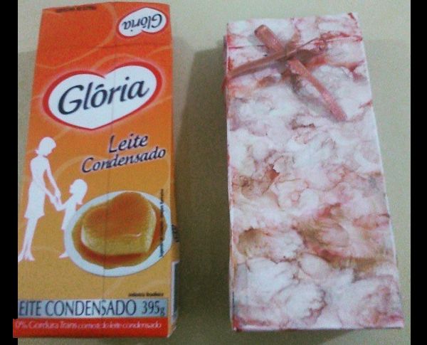 Além da caixinha de leite condensado, você também pode usar outros materiais recicláveis, como jornal velho, que se usado com uma camada protetora de cola branca comum, reveste de forma moderna a sua caixinha, com esta caixa de leite condensado podendo virar porta-trecos ou embalagens para lembrancinhas.