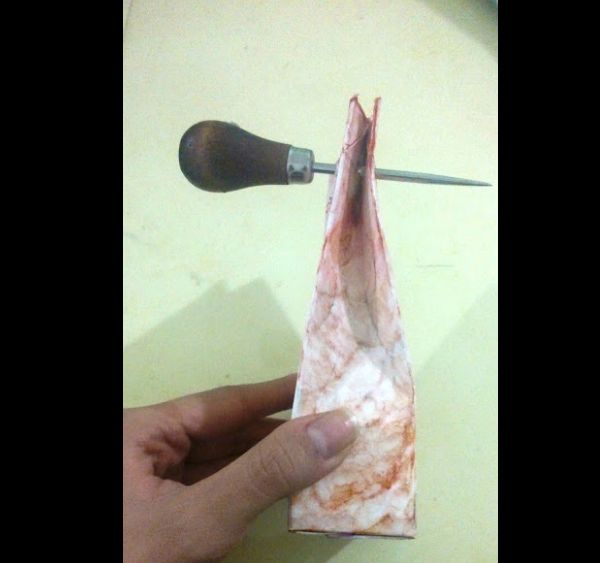 Após aplicar a acetona em toda a caixa de leite condensado, dobre as laterais para dentro, para virar uma embalagem e faça dois furos na parte superior, com um furador ou com a ponta da tesoura.