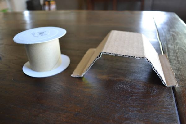 Em seguida, corte um pedaço de papelão, com formato retangular e dobre este retângulo de papelão de forma que crie duas abas nas pontas e uma parte reta no meio.