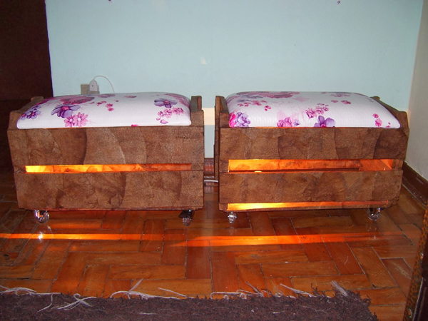 Fixe os rodízios na parte de baixo. Para finalizar a sua peça, coloque a almofada na parte superior e a fiação para luminária com a lâmpada, dentro do caixote. E está pronto!