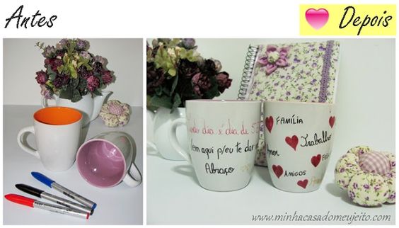 Para datas especiais você pode escrever uma mensagem em uma caneca de louça ou em qualquer objeto de sua preferência e fazer desenhos fofos e detalhes que deixem a mensagem ainda mais especial. Palavras soltas, ou palavras que marquem uma relação também é ótima saída para quem busca uma customização de caneca com caneta permanente, mas não tem muita experiência neste tipo de trabalho manual.