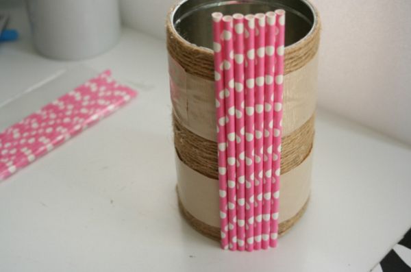 Agora, para finalizar a sua peça, assim que revestir toda lata com os canudos, amarre um pedaço de fio rústico no meio da lata e finalize fazendo um laço ou, não, com uma fivela ou enfeite de sua preferência em meio ao fio. E está pronto!