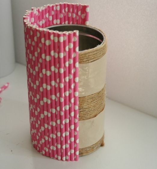 Logo após, siga fixando os canudos na lata. Neste exemplo foi utilizado apenas um tipo de canudo, porém, se você quiser, pode usar modelos diversificados de canudos em seu artesanato.