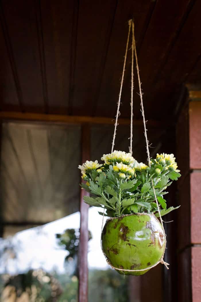 O seu artesanato feito com coco e, mais especificamente o coco verde, pode ser um diferenciado e sustentável vasinho suspenso. Retire toda parte interna do coco, coloque terra e os elementos que usa para plantar suas mudas ou sementes, aplique um verniz no coco, se quiser, e pendure da maneira que desejar, com barbante, fio, linha ou cordão.