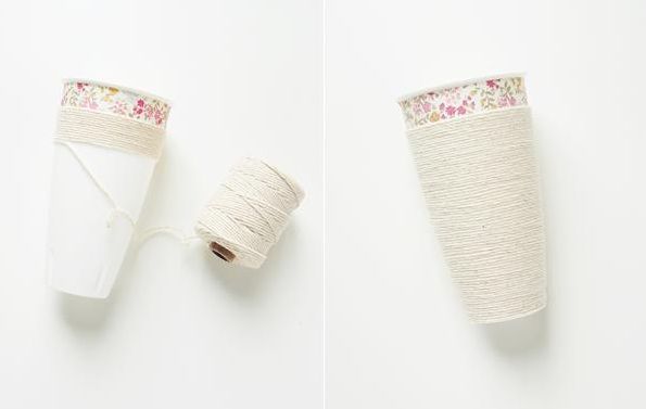 Em seguida, perto da borda do copo de plástico escolhido, cole um pedaço de fita adesiva de sua preferência. Depois cole a ponta do barbante escolhido em posição um pouco acima do local onde está a extremidade inferior da fita adesiva colada, para fazer um bom acabamento, e comece a enrolar o barbante ao redor do copo, colando as voltas do barbante em alguns pontos, para que o barbante não se solte com o passar do tempo.