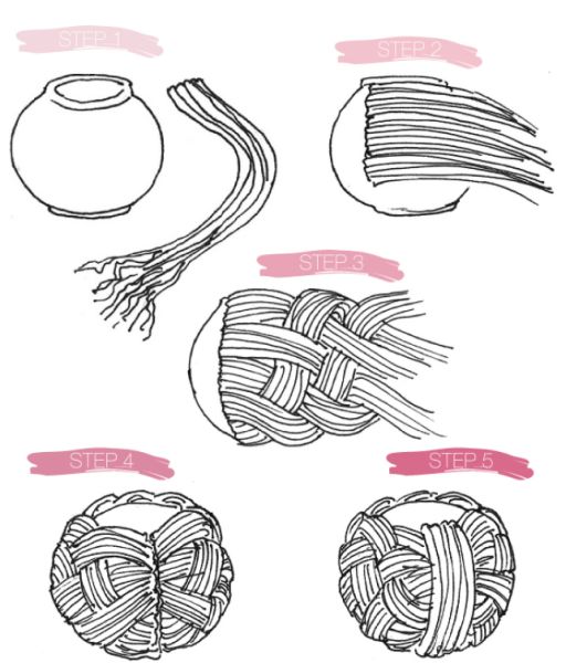 Logo após, para fazer um trançado mais sofisticado para pote redondo, cole em toda a altura do pote escolhido muitos pedaços de corda. Divida os fios em números iguais e trance todas estas mechas entre si. Como acabamento cole uma mecha de pedaços de corda na emenda do trançado, em posição vertical.