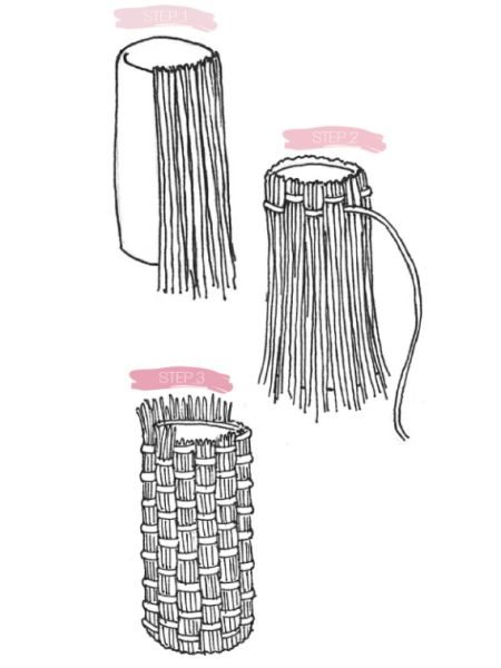 Em seguida, se você quiser fazer a personalização de pote que remete a um trançado de cesto, cole muitos pedaços de corda cão redor da base do pote. Depois trance apenas um pedaço de corda por entre vários pedaços que estão na posição vertical. Faça isso até o final. Como acabamento corte a sobra de corda da borda e cole algumas voltas de corda na base e na borda do pote.