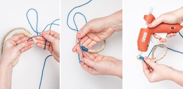 Comece separando todos os materiais que você vai utilizar em seu artesanato. Em seguida, amarre a primeira cor de linha escolhida na ponta da corda. Depois dê muitas voltas com a linha ao redor da ponta da corda e por último aplique cola quente na ponta da corda.