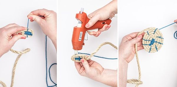 Logo após, comece a fazer um espiral com a ponta da corda e aplicando a linha ao redor das voltas da corda.