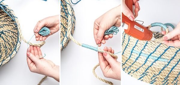 Agora, se achar necessário, passe a linha pela agulha para tapeceiro e continue passando a linha colorida entre as voltas da corda e colando a cada volta, assim que for aumentando o seu espiral, para manter todas as partes no lugar. Quando chegar ao tamanho de fundo desejado, suba as laterais da sua cesta, também enrolando e colando a corda e passando a linha colorida pelas voltas da sua corda.