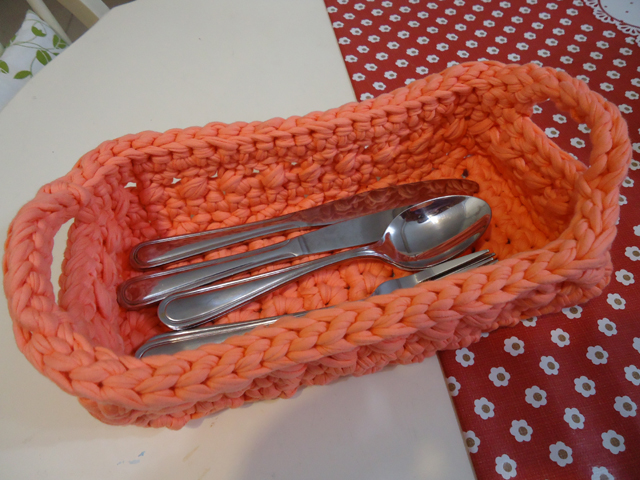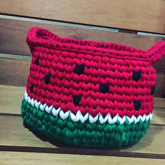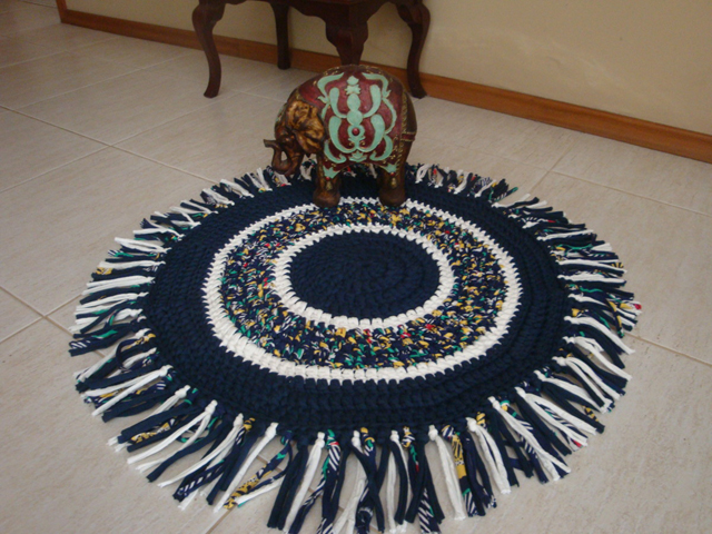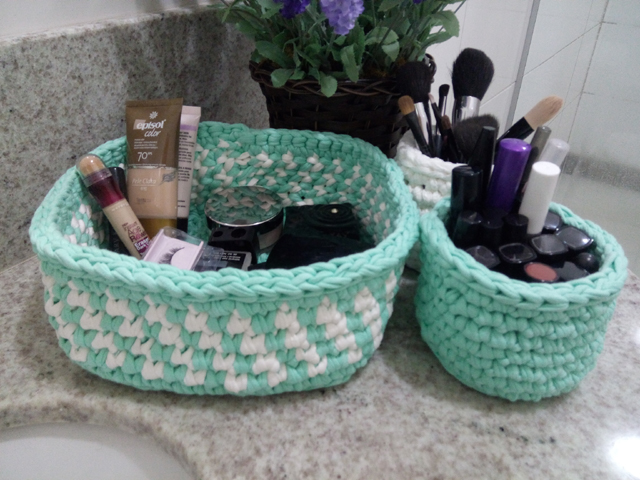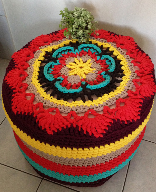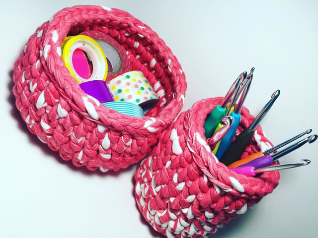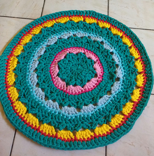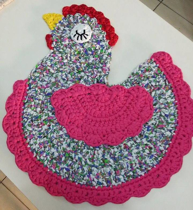 Comece separando todos os materiais que você vai utilizar em seu artesanato. Se você for cortar o fio de malha em casa, de uma camiseta velha, corte tiras com a mesma espessura e una uma tira à outra fazendo uma perfuração em uma das pontas e lançado a outra tira neste furo. Faça correntinhas para iniciar e una as pontas com um ponto baixíssimo. Vá fazendo carreiras de ponto baixo ou de ponto alto até chegar ao tamanho desejado. Arremate muito bem a ponta, ao final, para não desamarrar e se soltar com o passar do tempo. E está pronto!