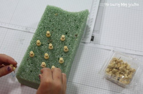 Para finalizar a sua peça, fixe dois pinos na parte detrás da sua folha de cortiça, com um pino devendo ficar de cada lado superior e amarre um pedaço de fita, para pendurar. E está pronto!