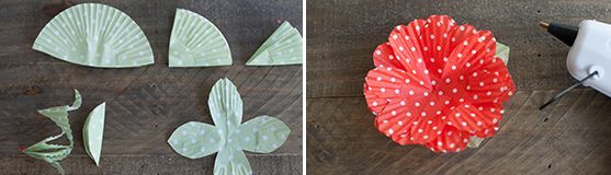 Em seguida, para fazer as camadas de pétalas de sua flor estilizada dobre uma forminha de doce ao meio, depois dobre novamente e mais uma vez. Então corte a borda de forma arredondada. Corte cinco forminhas de doce com a mesma cor ou com a mesma estampa, para fazer as camadas da sua flor estilizada.