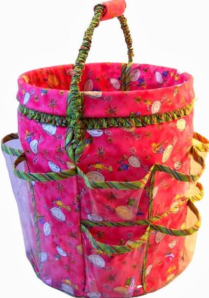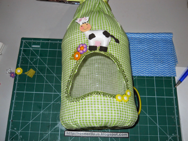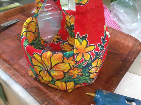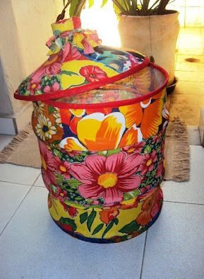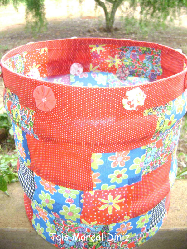 Vá colando muito bem as partes, com a cola quente, para não soltar com o tempo. Para finalizar a sua peça, encape a parte de dentro da cesta com o mesmo tecido. E está pronto!