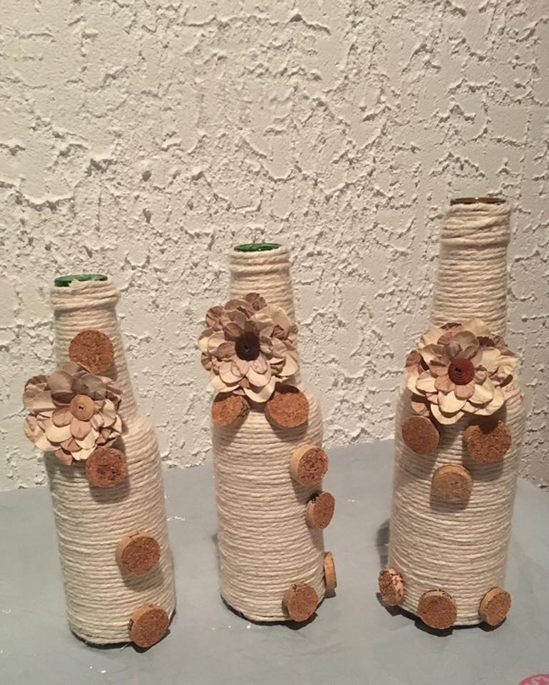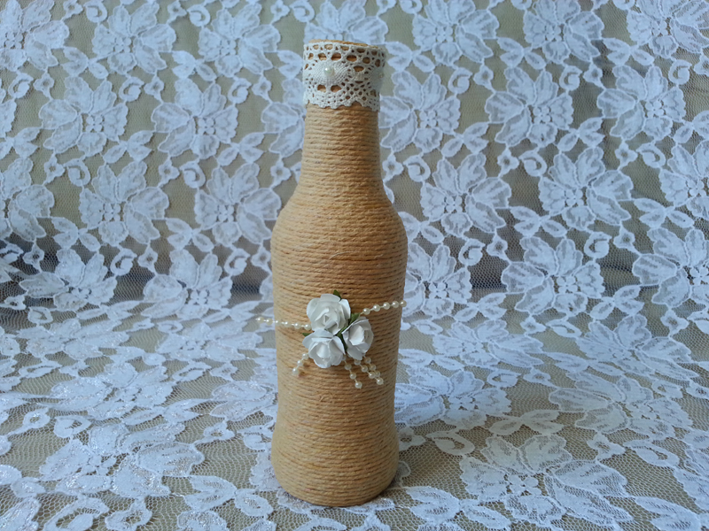 aplicação de flor na garrafa com barbante