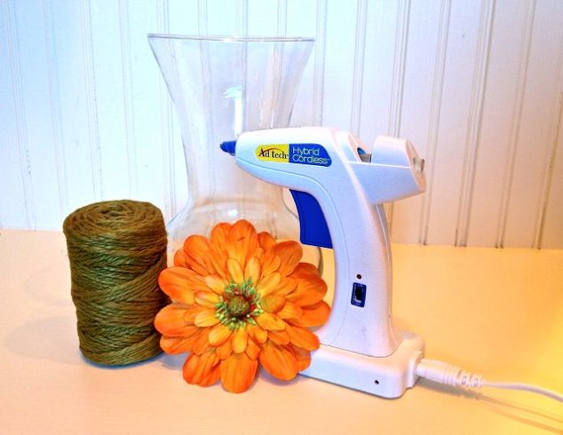 Siga enrolando o fio escolhido ao redor da sua jarra de vidro, colando as voltas em alguns pontos, pingando gotas de cola quente.