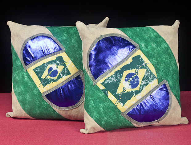 Corte dois retângulos na lona com medida de 46 cm x 37 cm. Em uma das partes pinte o que quiser. Deixe secar. Posicione uma parte do trabalho sobre a outra, com os lados dos direito juntos, para dentro, e prenda a franja ao redor, com a franja devendo ficar entre as duas partes e para dentro. Costure ao redor, mas deixando uma abertura. Depois vire a peça para o outro lado. Para finalizar a sua peça, coloque a sobra de lona da abertura para dentro e passe uma costura ao redor, pespontando. E está pronto!