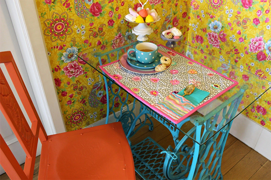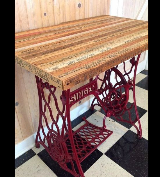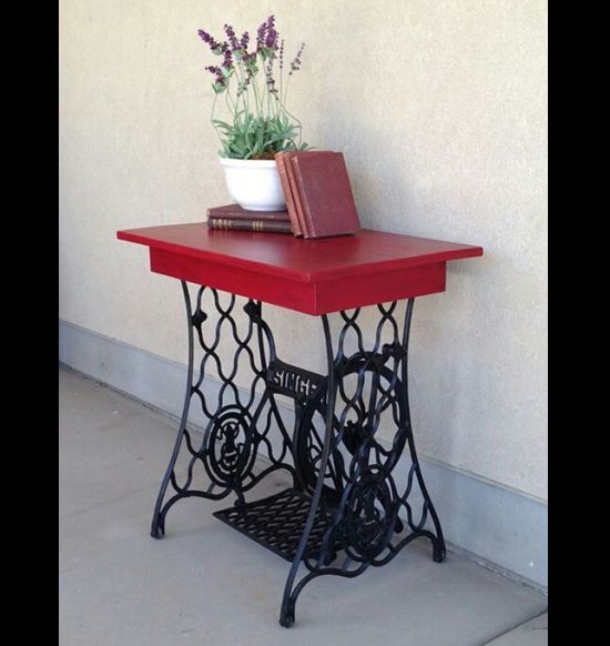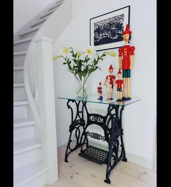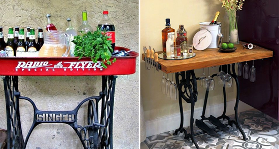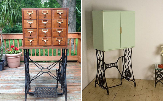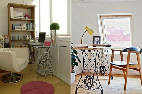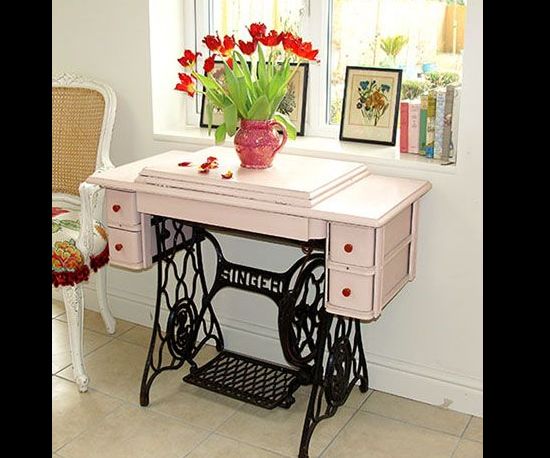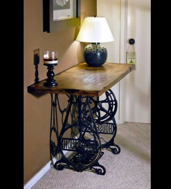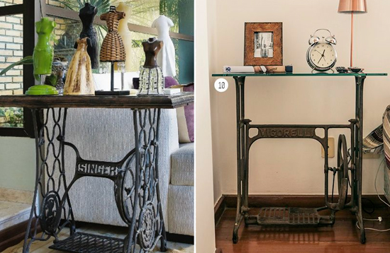 O pé de uma máquina de costura antiga pode ser a estrutura de uma mesa, de um aparador e ficar em qualquer cômodo se sua casa, até mesmo no banheiro.