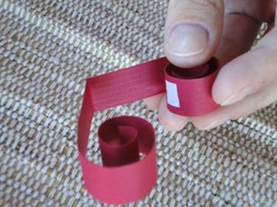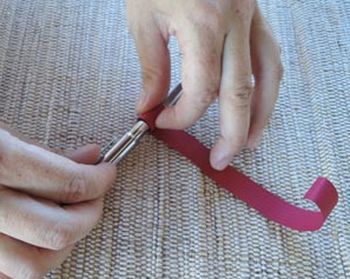 Em seguida, comece a fazer os corações. Para isso, dobre a tira ao meio. E enrole as bordas para fazer arabescos. Use um lápis ou uma caneta. E se você desejar arabescos bem miúdos utilize um cilindro mais fino, como o cabo de um pincel.