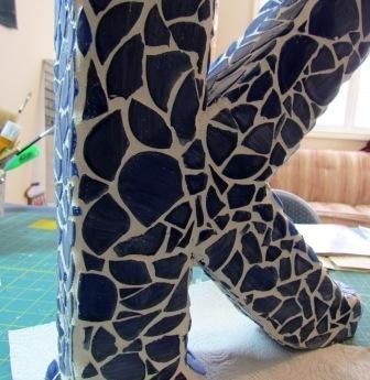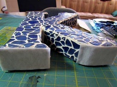 Agora, cole os pedaços de azulejos com o auxílio da pistola de cola quente sobre toda a sua letra.