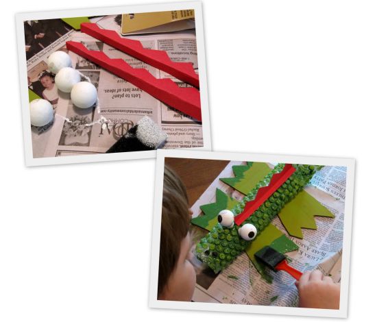 Em seguida, pinte o seu jacaré com o auxílio do pincel e também das bolas de algodão. E corte as “patas” do jacaré no pedaço de papelão e também pinte, com as tintas verdes.