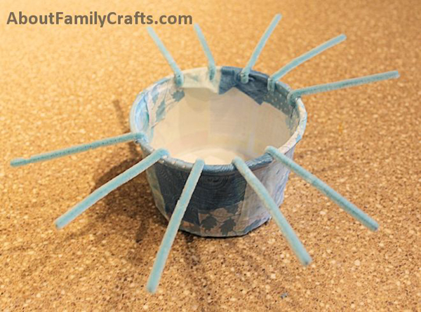 Fure o pote e enfie dois pedaços de limpadores de cachimbo dobrados.
