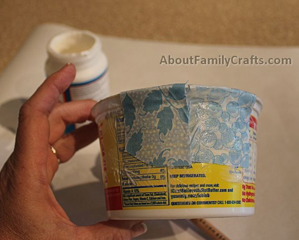 Comece separando todos os materiais que você vai utilizar em seu artesanato. Aplique cola e cole os retalhos de papel no pote de margarina.