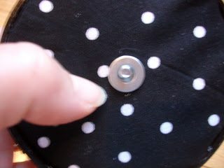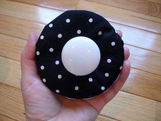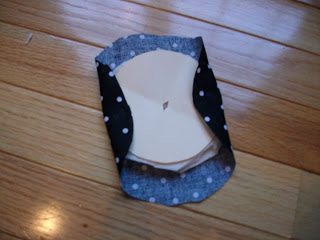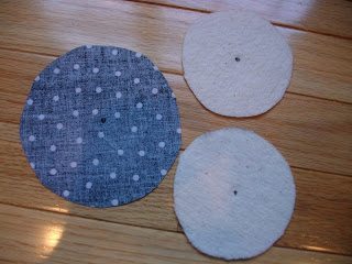 Agora, posicione o tecido, com o direito para baixo, os dois círculos de manta acrílica ou de espuma e por cima o círculo de papelão. E comece a encapar os círculos com o tecido.